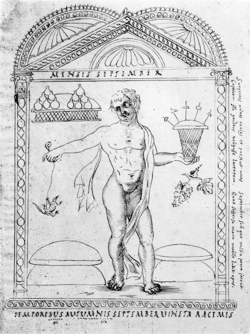 The images come from these manuscripts: Barberini Ms: February, March (another March from the Brussels ms. is included by Strzygowski as plate 21), August, September, October, November, December. Vienna Ms: April, May, June, July. Plates 29 and 31 are the facing pages from the Rome ms. for October and November.